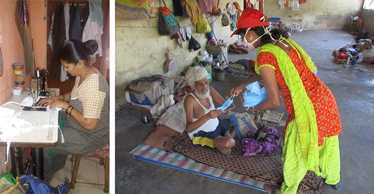 PRASAD Chikitsa está reclutando a miembros de los Grupos de Autoayuda de Mujeres, para elaborar mascarillas de protección, no disponibles en el área. PRASAD está suministrando los materiales para que las mujeres hagan en sus hogares las mascarillas, que posteriormente se esterilizan. Están elaborando aproximadamente 80 mascarillas al día y la semana pasada se distribuyeron cien entre las personas sin hogar del pueblo de Ganeshpuri. Ellas están muy agradecidas por esta oportunidad de ayudar a su comunidad y planean seguir haciéndolo mientras sea necesario.